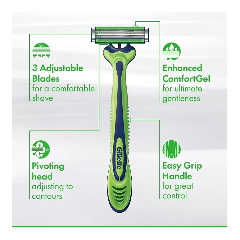 The Gillette Sensor3 Sensitive disposable razors are designed to provide up to twelve gentle shaves per razor. These razors feature three chromium-coated, skin-sensing, adjustable blades and a forty-degree pivoting head that automatically adjusts to the contours of your skin. This ensures a close, smooth, and comfortable shave every time. The skin guard fins, equipped with five elastomer fins, gently stretch the skin to create a smooth, even surface for an optimal shave.