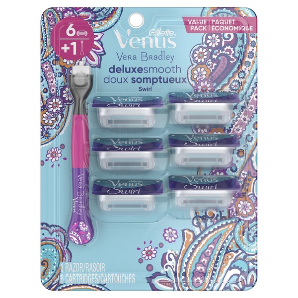 Gillette Venus Vera Bradley Deluxe Smooth Women’s Razor Handle + 6 Cartridges, Blue and Pink