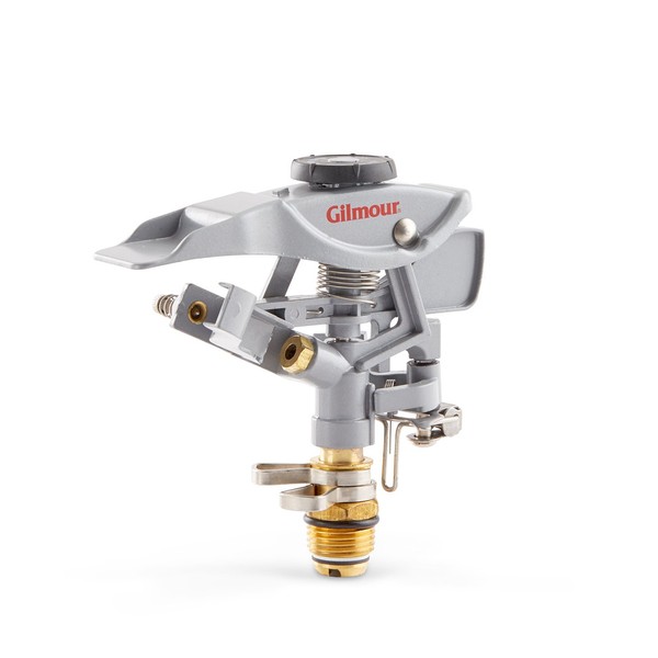 Gilmour Metal Impulse Sprinkler Head Only Water coverage up to 5800 square feet or 86 foot diameter. Trip levers for full or partial coverage with reversing full circle setting. Comes with a diffuser screw for easy adjustment of water stream. Head only, no base.