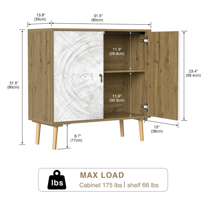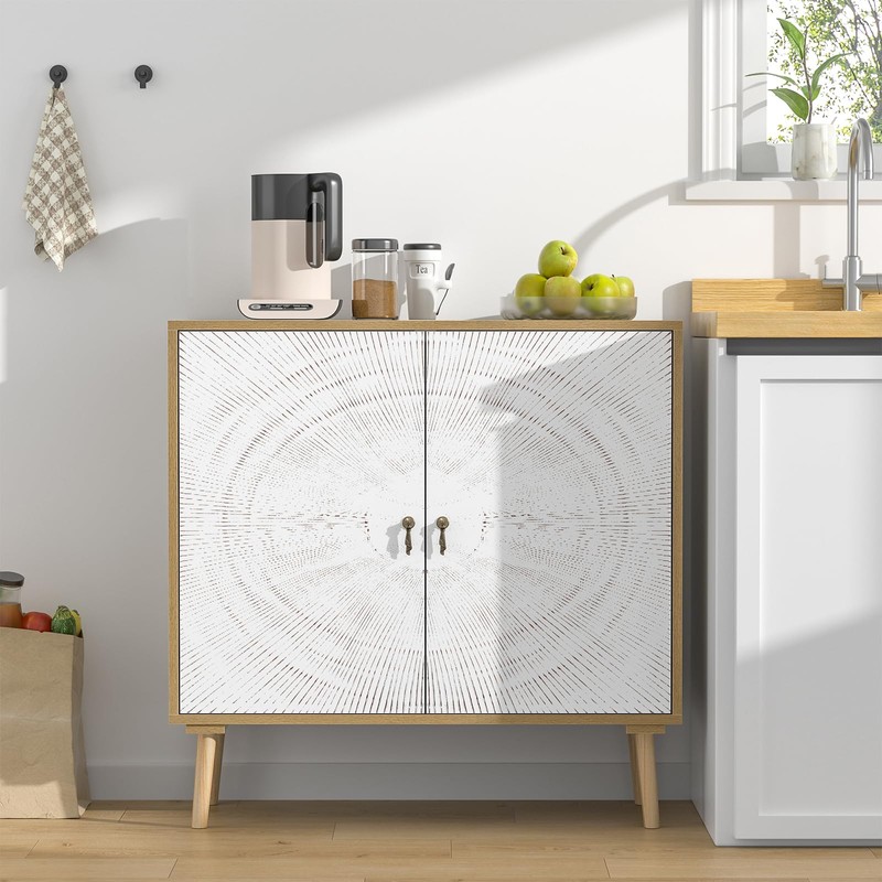 - Elegant Design: This 2-door Storage Cabinet features beautifully carved white patterns on the door panels, adding a touch of sophistication to any space. The chic and timeless look makes it a perfect Decorative Sideboard for your home.