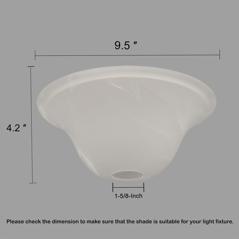 Features a 9.5" diameter glass shade and 4.2" height. The bottom circular hole is 1.625"(41mm) in diameter. Please check the dimension to make sure that the shade is suitable for your light fixture.