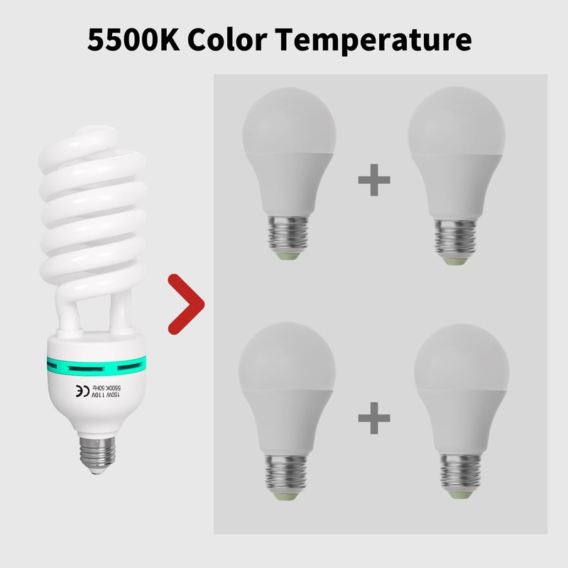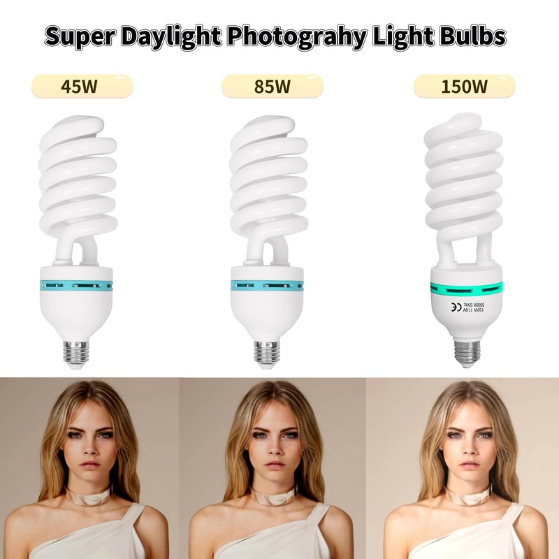- 2. Wide Range of Uses:150W CFL Spiral Bulb can be used not only for photography, but also suitable for daily lighting or planting, and you can use it as a replacement bulb or upgrade your softbox lighting kit, 135W Photography light bulbs for E27 bulbs, Studio Lights, Camera Lights and Video Lighting.