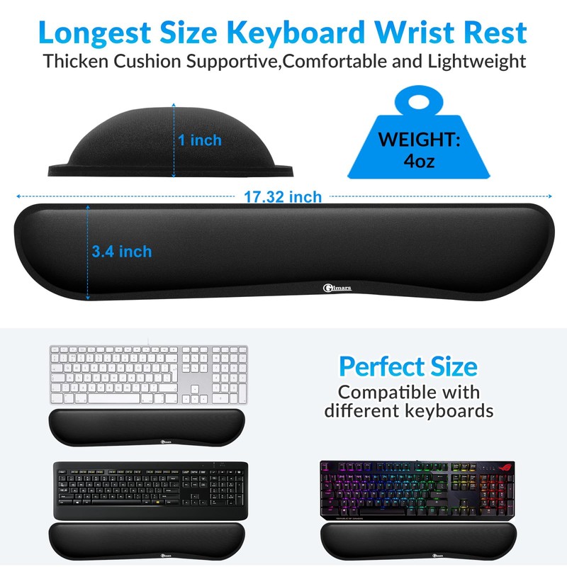 - 【SIZE EXTENDED AND WIDENED】-Perfect size of the 17.3*3.4*1 inch keyboard wrist pad fits all computers,laptops and gaming keyboards.Our wrist rest uses the Unique Ergonomic Shape Design to improve hand and wrist posture, avoid joint and wrist problems, and release elbow and shoulder pressure caused by long-term computer use.Lightweight of 4oz also makes it easy to carry and use anywhere.