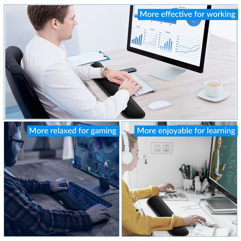 - 【ERGONOMIC DESIGN】-Keyboard wrist rest with special wave design fits your hand better. Deformation free keyboard pad,stands still while typing.Relaxing and comfortable use such as home, office, cybercafe, etc. Keeps wrists in a straight line instead of at an angle to the keyboard.Idea choose for office worker,gamer,writers,students,editors designers and other people who use computers for a long time.