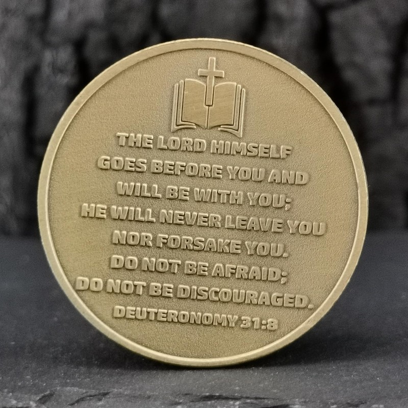 - Inspired Scriptures: The front showcases the Life Tree, symbolizing faith firmly rooted in Christ. On the reverse side, the raised scripture reads "'THE LORD HIMSELF GOES BEFORE YOU AND WILL BE WITH YOU; HE WILL NEVER LEAVE YOU NOR FORSAKE YOU. DO NOT BE AFRAID; DO NOT BE DISCOURAGED - DEUTERONOMY 31:8," emphasizing God's presence and strength
