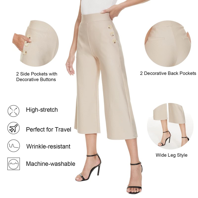 Ginasy Wide Leg Pants for Women Business Casual Dress Pants Stretch High Waist Crop Capris Culottes Beige