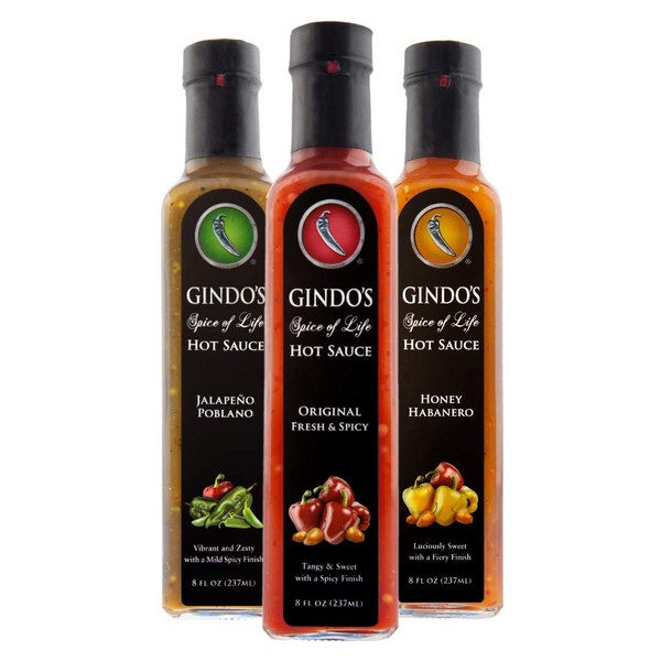 - Gindo's Original Fresh and Spicy, Jalapeno Poblano and Honey Habanero.
