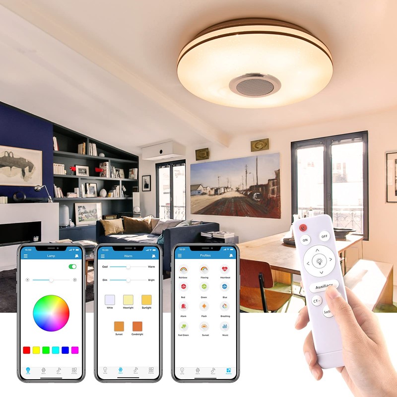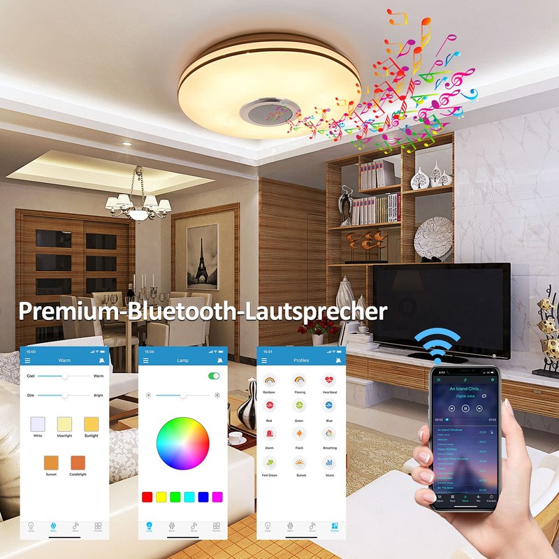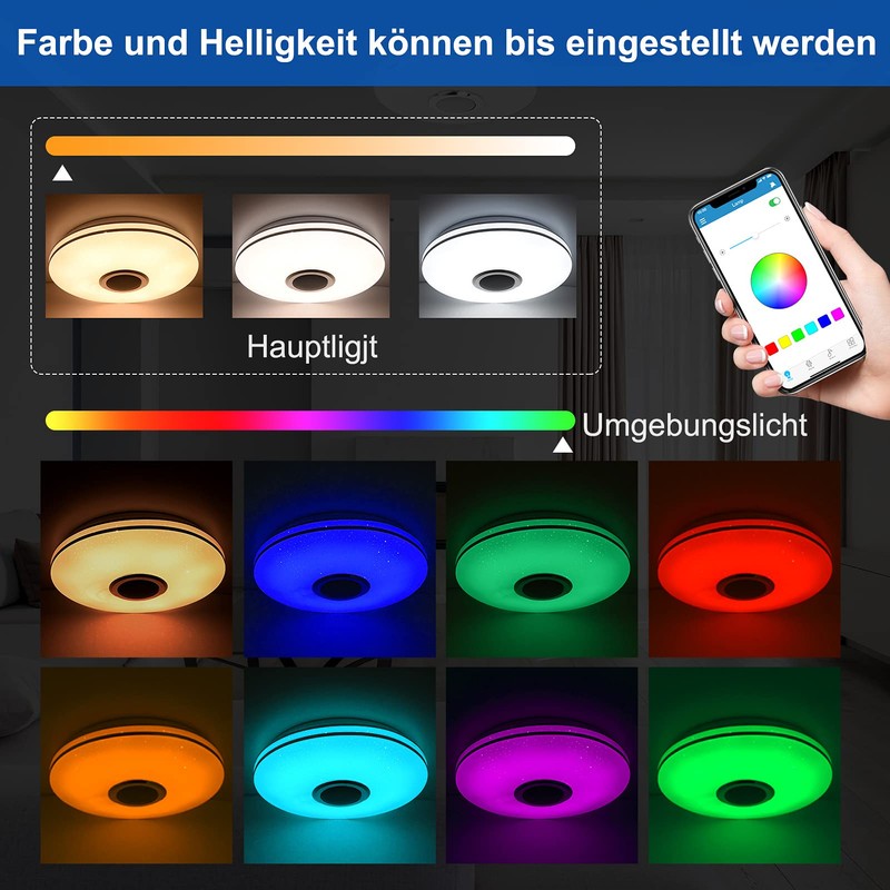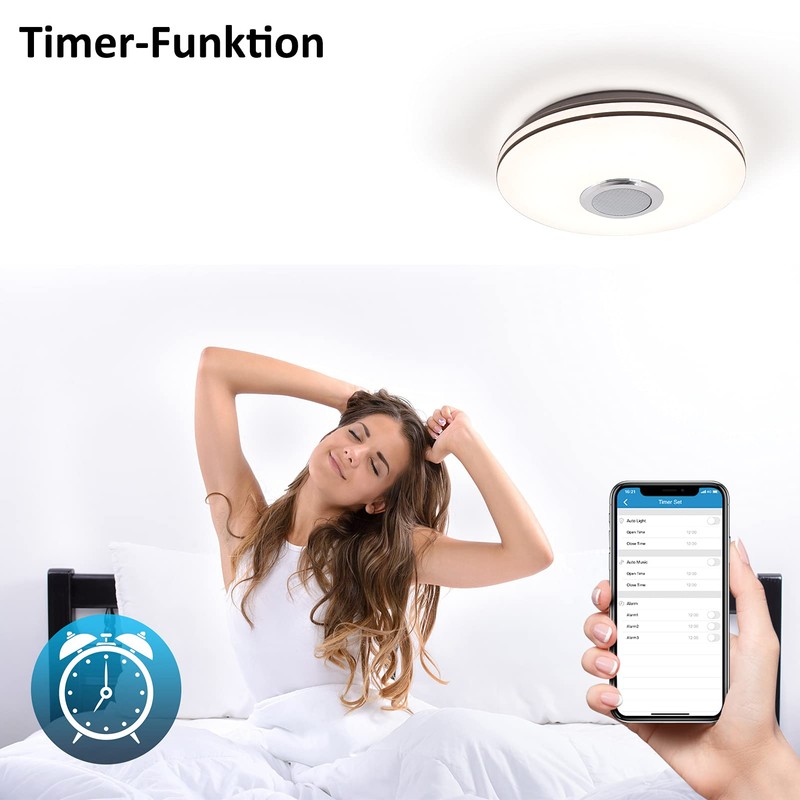 - Neues UpgradeLED Deckenleuchte eingebaute hochwertige Bluetooth 5.0 Lautsprecher, k?nnen Sie einfach Bluetooth auf Ihrem Handy oder Tablet verbinden, k?nnen Sie ihre Lieblingsmusik, die Kombination aus Licht und Musik fr unbegrenztes Glck wechseln. Es wird automatisch ein- und ausgeschaltet nach dem von der APP festgelegten Zeitplan. Es kann als Wecker verwendet werden und kann Musik abspielen, wenn die Lichter eingeschaltet sind, was eine gro?artige M?glichkeit ist, Sie aufzuwecken