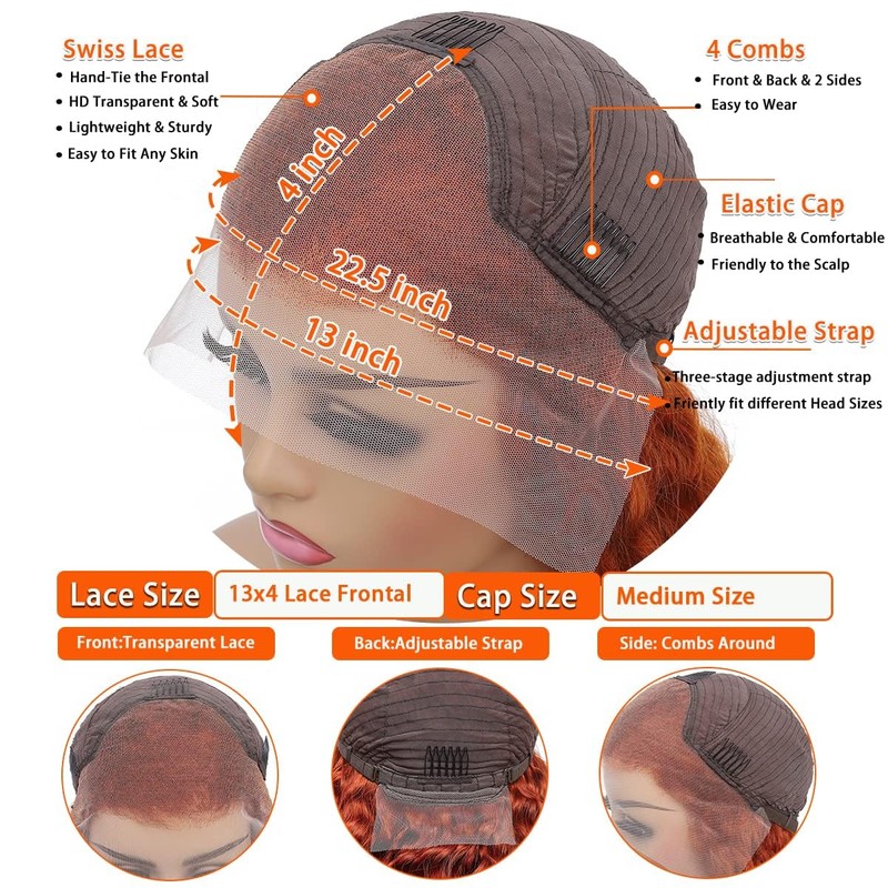 - 【350# Ginger HD Transparent Glueless Wigs Human Hair Cap Size】Durable and Breathable Medium Size Elastic Cap ( 22.5 Inches) with 4 Combs and 2 Adjustable Straps, Fit Your Head Perfectly