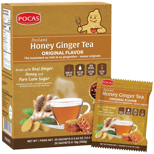 Ginger Pocas Honey Ginger Tea - Instant Tea Powder Packets with Ginger Honey - 20 Ct