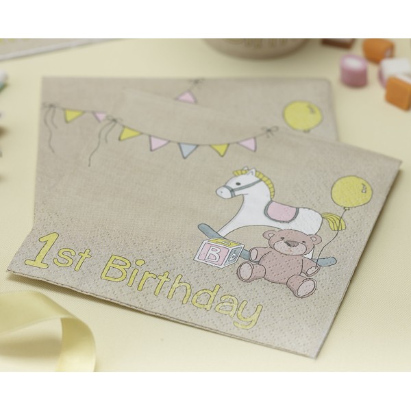 - Pack of 20 paper napkins with 1st Birthday printed on them with rocking horses