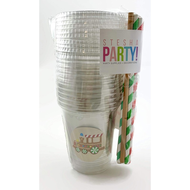 Gingerbread Train Christmas Party Cups with Lids and Straws (12 Count)