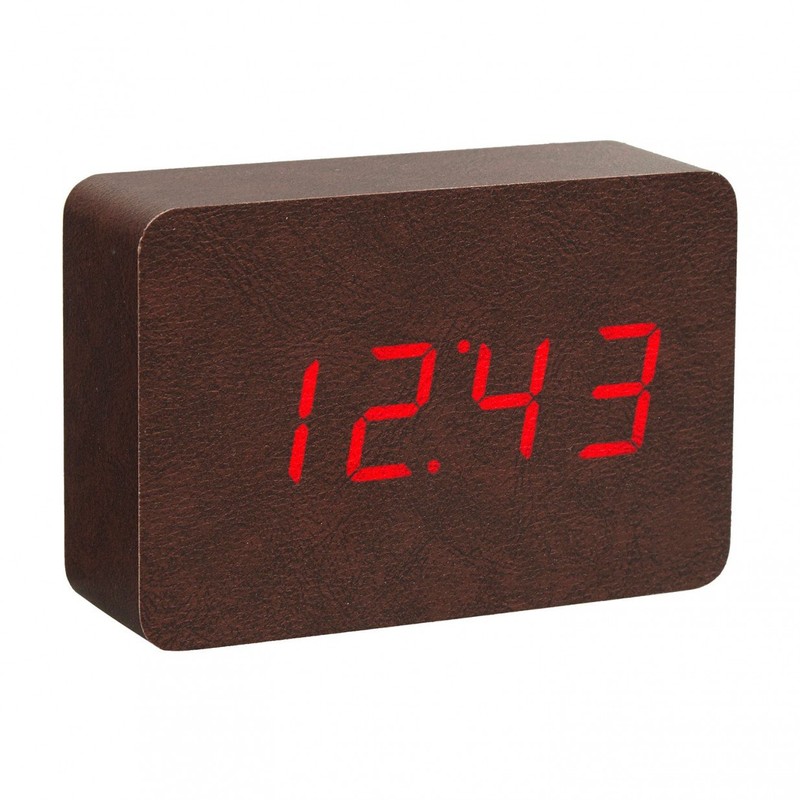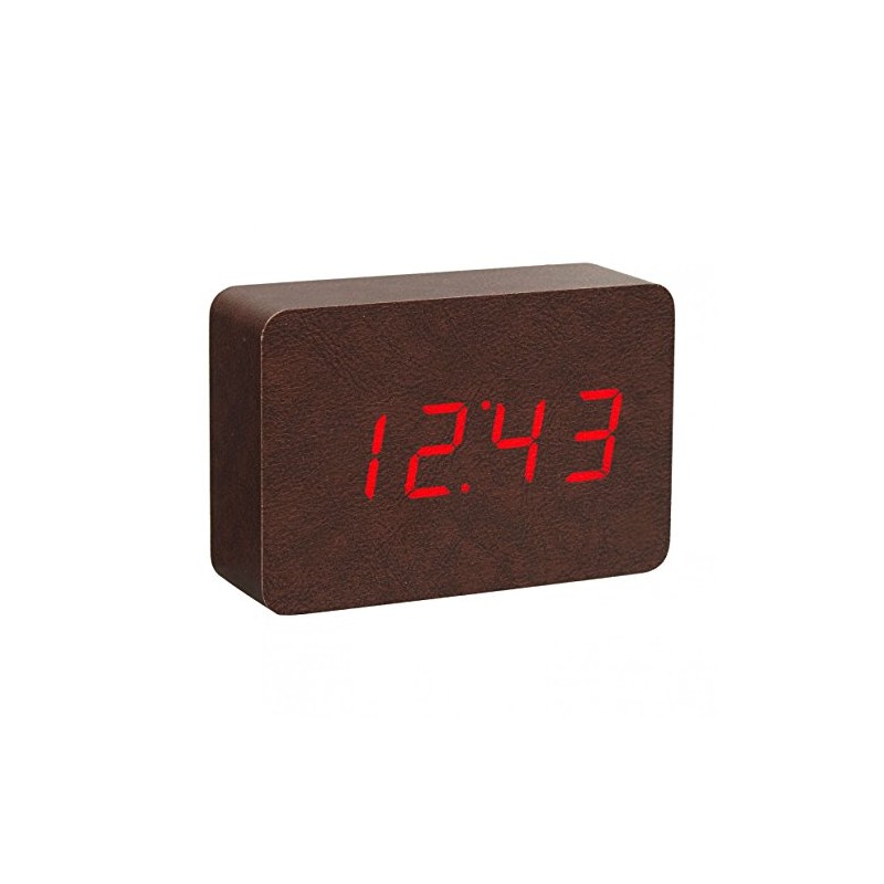 Gingko Brick Click Clock 8" x 6" Time/Date/Temp Alarm Clock Brown Leatherette Red LED