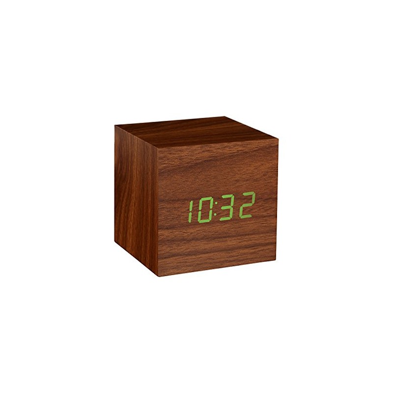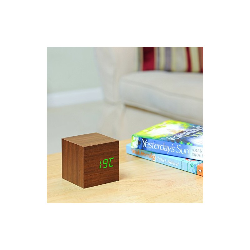 Gingko Cube LED Click Clock Alarm Clock With Sound Activation (Time, Date & Temperature), Walnut/Green LED