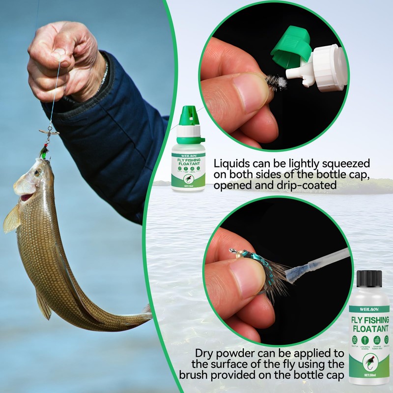 Liquid type: Just apply a small amount of float agent evenly on the dry fly before immersing it in water.