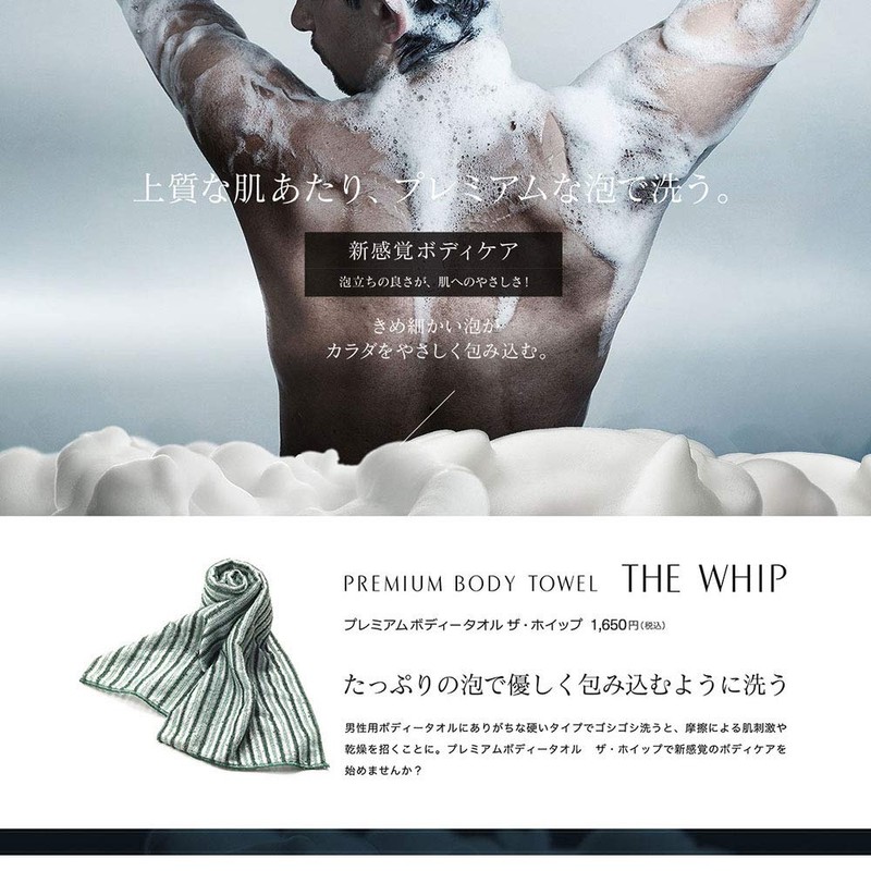 - (A new feeling of washing with a premium body towel) Are you still scrubbing? When washed with a hard type common to men's body towels, it will cause skin irritation and dryness due to friction. The Whip is an original body towel from GINO that pursues good foam and gentle on the skin. The fine foam gently envelops the body and moisturizes the skin of men who suffer from dryness. Are you starting to get a new feeling of body care with premium skin and washing with premium foams?