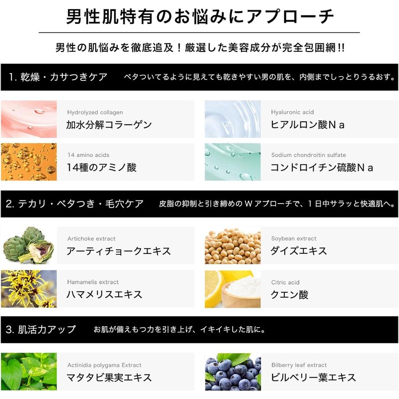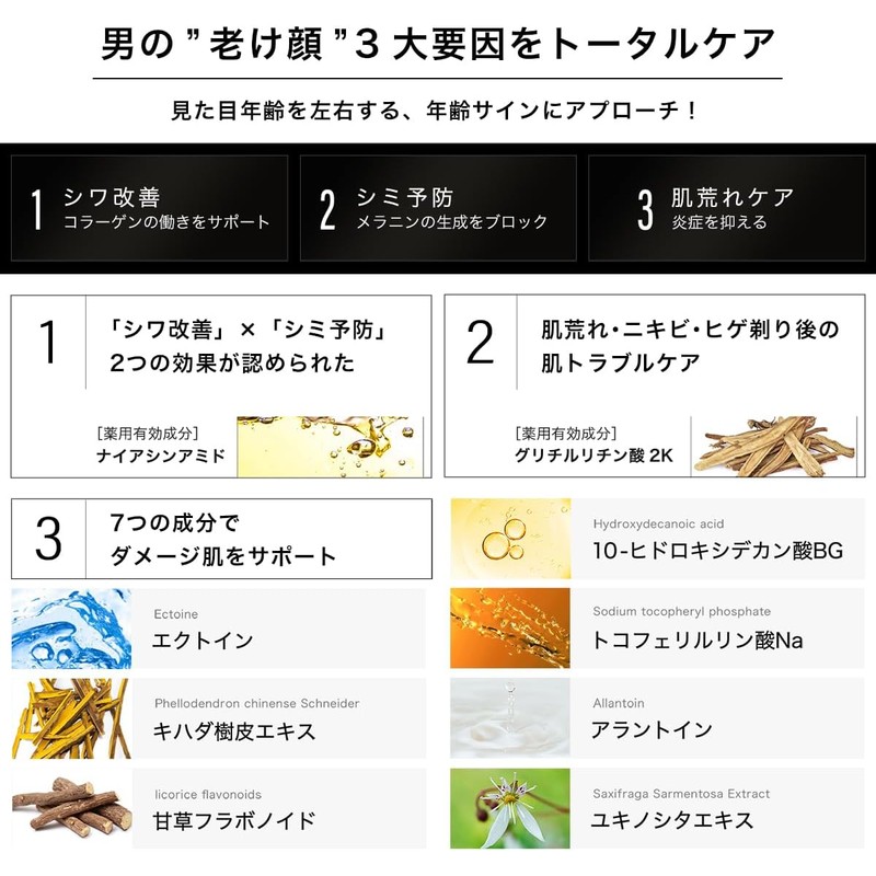 - [One application in the morning and evening will change your appearance and age] Men's skin may seem tough, but it is chronically lacking in moisture due to damage caused by daily shaving, dryness, UV rays, etc. Many men suffer from dryness, wrinkles, razor burn, shine, sagging, and dullness, but this all-in-one serum is for men who don't know how to care for their skin and want to care for it easily. It contains carefully selected beauty ingredients that address men's skin problems, and it is a lotion, milky lotion, serum, and cream all in one bottle, so you can complete your care with just one application. It can be used easily and smartly even on busy days! [No coloring/No fragrance/Alcohol-free/No mineral oil/No silicone/No paraben]