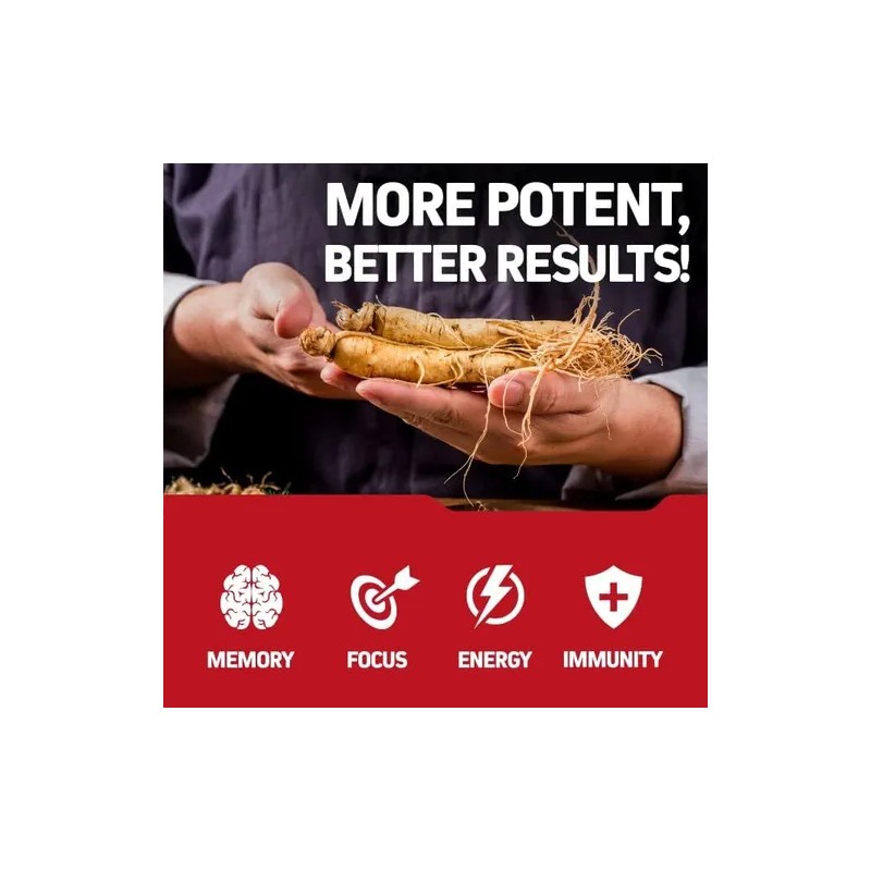 Suplemento ultra fuerte formulado científicamente con un alto % de ginsenósido, que contiene ginseng único y potente necesario para apoyar la mejora del rendimiento y el bienestar general.