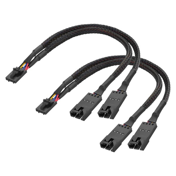 - Connector 1: 4-pin female plug; Connector 2: Two 4-pin male plugs; Cable specification: 26AWG; Cable core: Tin plated copper; Type of woven mesh cover: PET woven mesh cover; Insulation material: PVC; Product quantity: 2 pcs; Cable length: 22cm/8.66 inches (note: including plug length).
