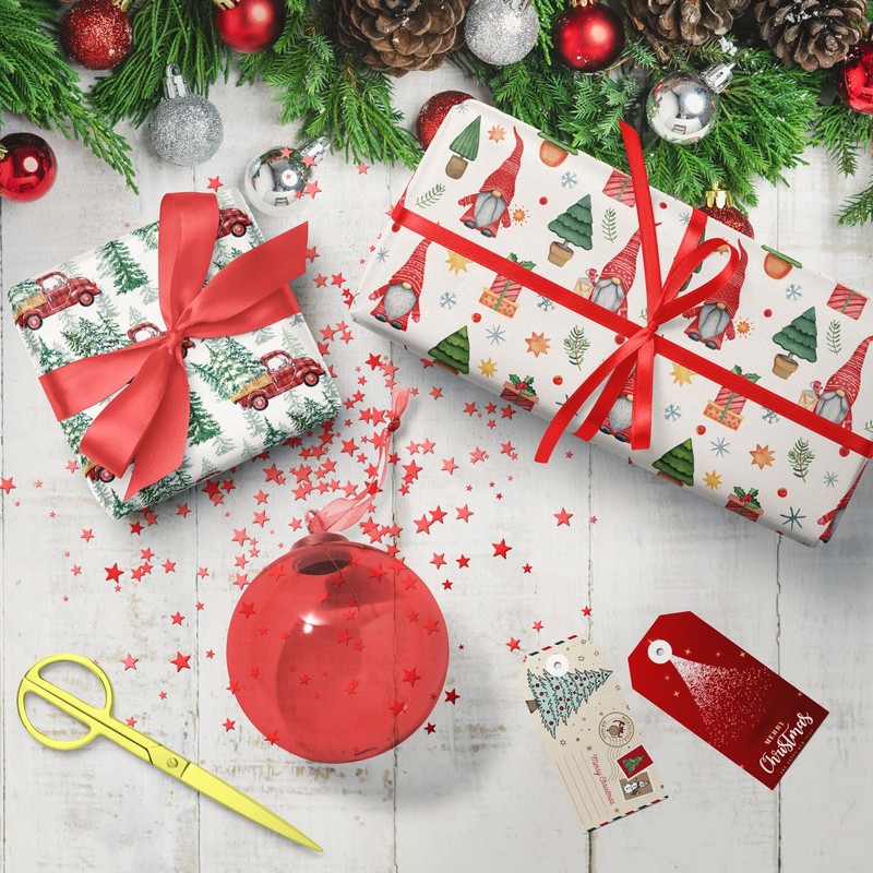 Printed on premium opaque paper with a matte finish, these sheets fold neatly, resist tearing, and provide excellent coverage that conceals gifts completely. Free of glitter and foil, the wrap is tape-friendly, easy to use, and recyclable after the holidays (depending on local guidelines). Whether you’re wrapping gifts for Christmas morning, birthdays, weddings, or holiday parties, this playful gnome design adds charm and delight to every package.