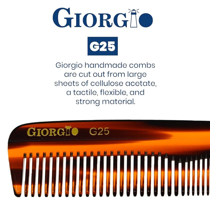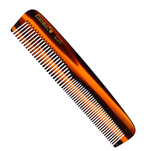 Giorgio G25 Pocket Comb 5.1 Inch Small TortoiseShell finish. Coarse / Fine teeth, Flexible women and men Hair, Beard & Mustache Pocket Comb. Hand-Made of quality Durable Cellulose, Saw cut and Hand Polished for ultimate and effortless smooth glide. Prevent Pulling and hair breakage. Rounded tips for sensitive scalps and release of hair's natural oils. Hand Made of quality Cellulose , a non-petroleum base material, that’s why they have minimal static.Smooth, rounded teeth for sensitive skin stimulating the hair cuticle’s and release of hair's natural oils for a hair strong and healthy. Anti-static. A women and men favorite comb for both hair and quick beard and mustache care. Easier to clean than wood. Unlike beard brushes, combs for beard and moustache are best used on damp hair. Ease to clean with shampoo under the tap.
