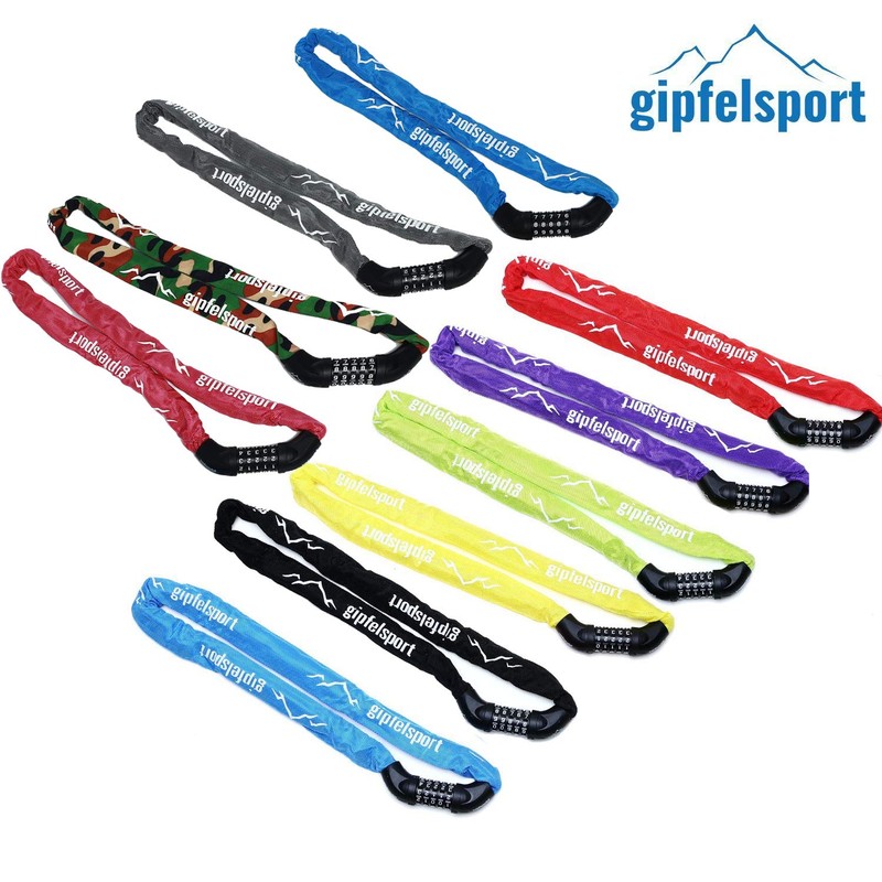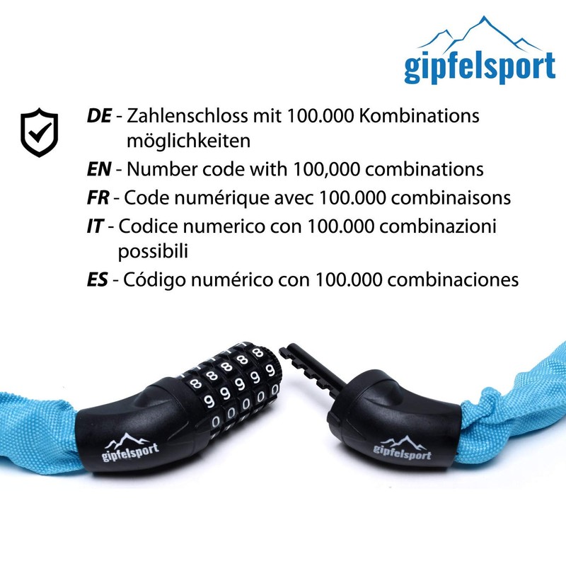 The premium bicycle lock from gipfelsport consists of a 6 mm hardened steel chain and secures your bike from thieves. Thanks to the five-digit number code, up to 10,000 combinations are possible to lock your bike safely. There is a textile tube around the steel chain to prevent paint damage to the bike.