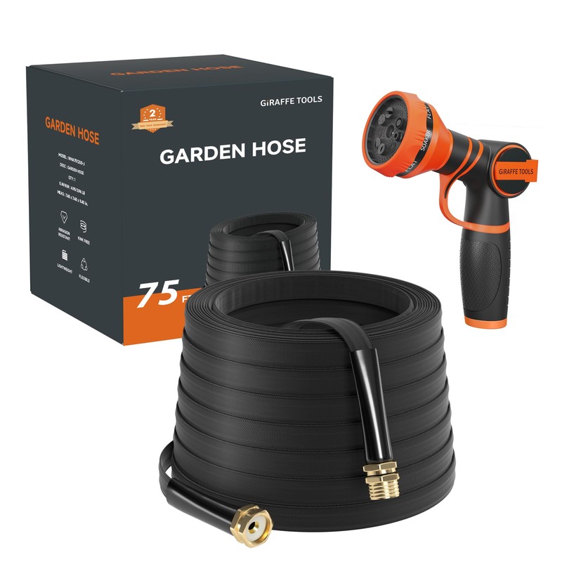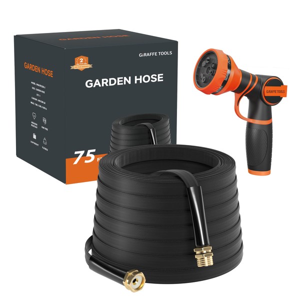 Giraffe Tools Garden Hose 75FT Lightweight Lay Flat Water Hose Kink Free Flexible Hose with 9 Spray Function Nozzle, Black