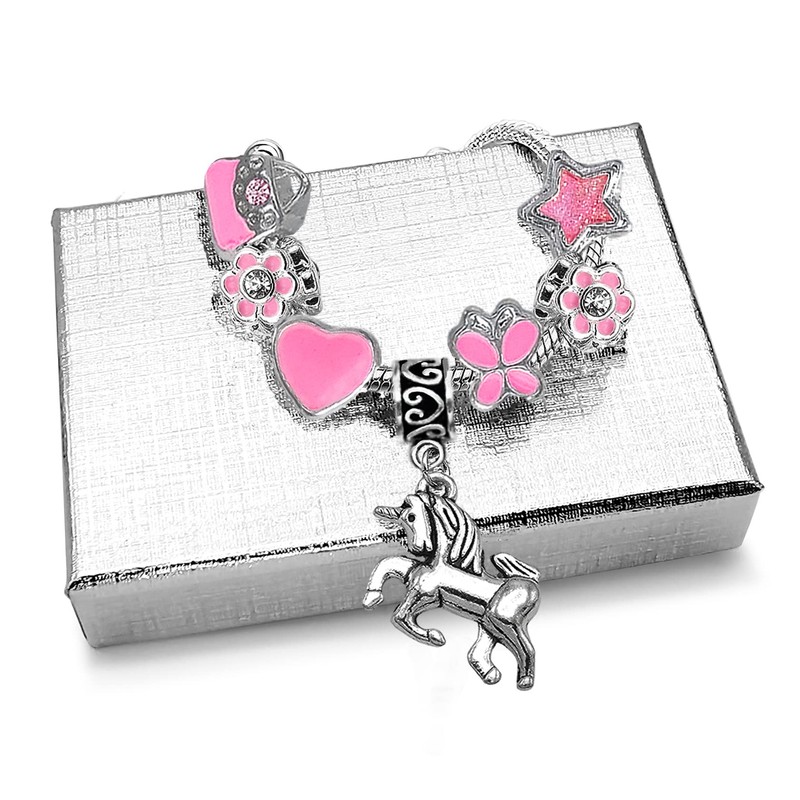 - Contents Include: 1 x16cm Silver Plated Charm Bracelet with 5cm Extender Chain (Lead and Nickel Free), 1 x Sparkly Glitter Star Charm, 1 x Silver Plated Rhinestone Handbag Charm, 1 x Silver Plated Enamel Heart Charm, 1 x Silver Plated Enamel Butterfly Charm, 2 x Sparkly Rhinestone Flower Charms, 1 x Silver Plated Unicorn Pendant, 1 x Gift Box