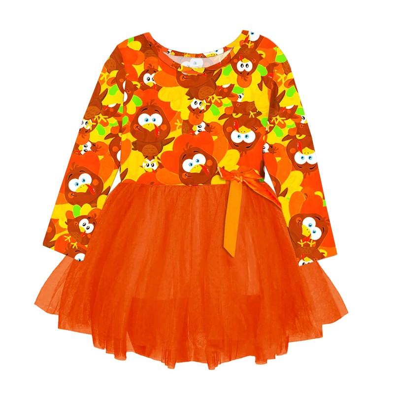 - Girls long sleeve tulle dress features a Cute Thanksgiving Turkey print on the bodice and a ruffle layered soft lining tutu skirt embellished with a ribbon bow. Crewneck design, A-line casual dresses