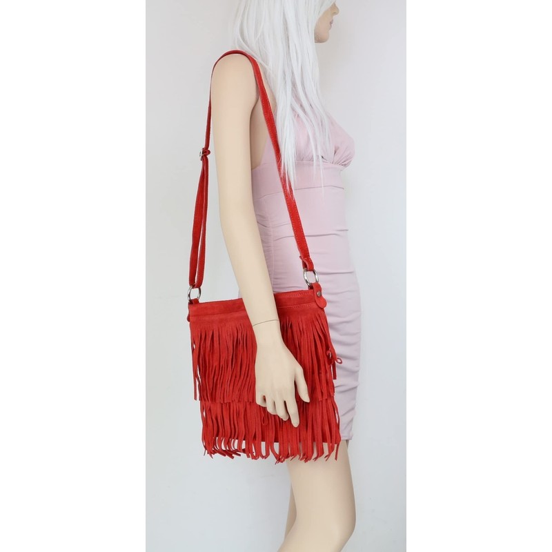 - New genuine suede shoulder bag with fringe details on the front.