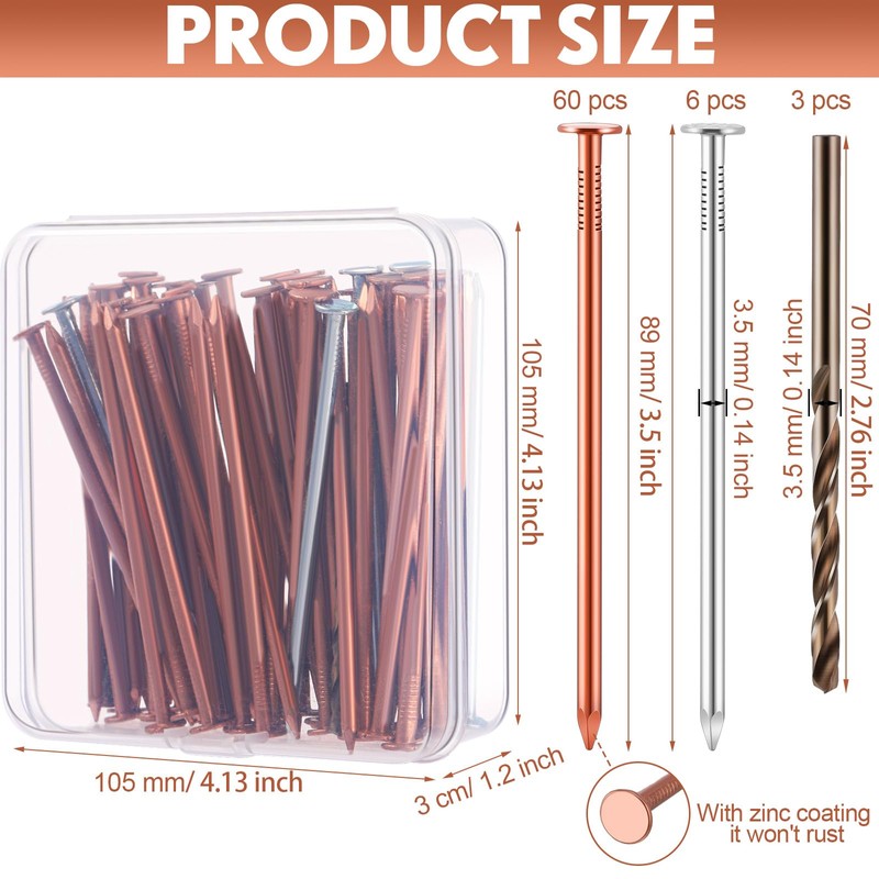 - Detailed Dimensions: steel nails and copper nails for killing trees are about 0.14 x 3.5 inches/ 3.5 x 89 mm, cobalt drill bits measure about 0.14 x 2.64 inches/ 3.5 x 67 mm, compact and easy to store; The plastic storage box measures approximately 4.13 x 2.95 x 0.98 inches/ 10.5 x 7.5 x 2.5 cm, providing ample storage space for nails and keeping them organized