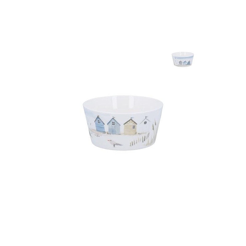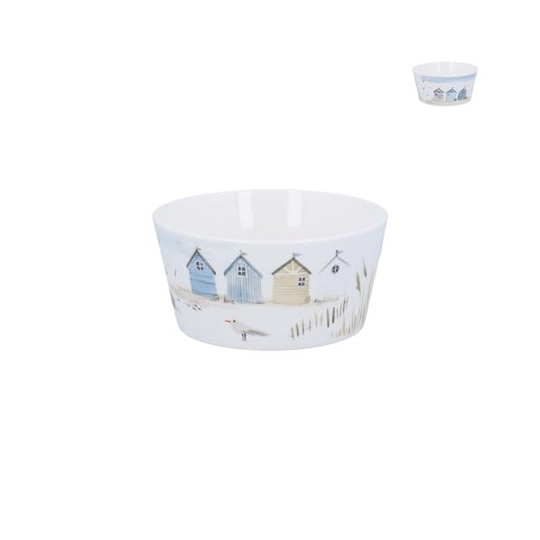 - Beautiful beach hut pattern mini bowl featuring charming coastal scenery with blue and beige beach huts and seabird detail by Gisela Graham
