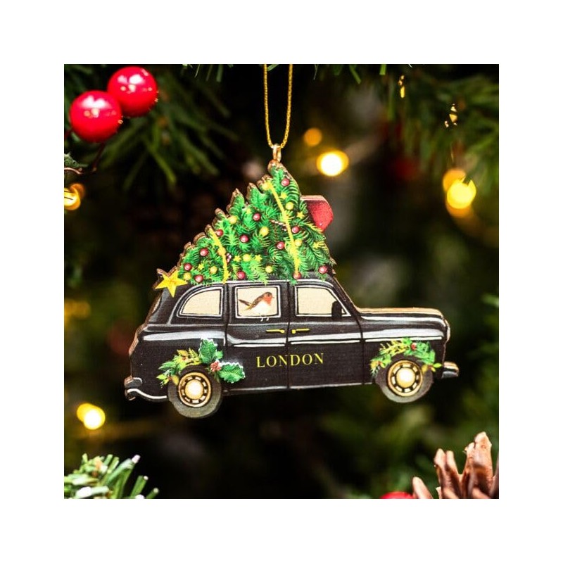 - Double sided christmas traditional taxi cab decoration with a festive rebin in the window and holly over the wheel arches