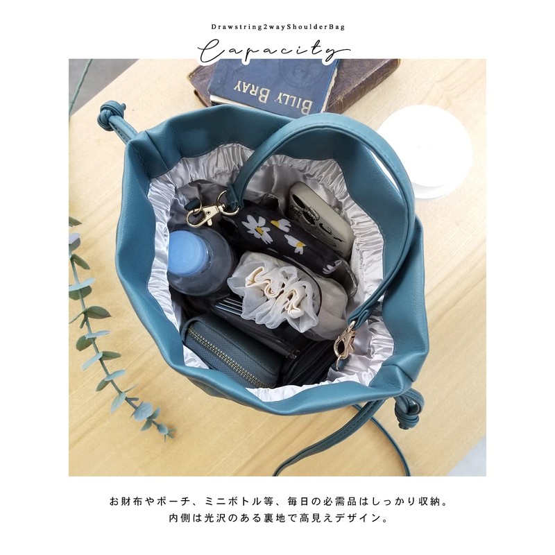 A 2-way drawstring bag with a loose shape. Soft and elegant faux leather material that can be used all year round. Conveniently sized enough to securely store your daily necessities, such as wallets, pouches, mini bottles, etc. The interior is lined with a high visibility design. A shoulder bag or hand held bag can be coordinated with a wide range of styles.