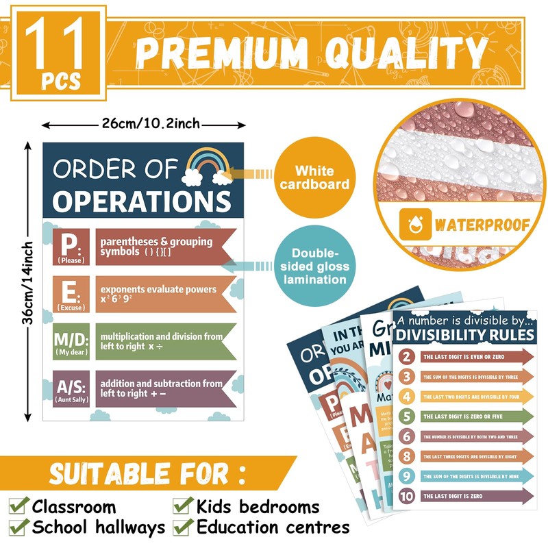 - Premium quality: Made with quality card stock and a protective laminated PET film layer, our 11-piece math posters for classroom set is ideal for use as a bulletin board display. The math poster bulletin boards are waterproof, tear-resistant, and reusable, and you can easily erase any marks made with water-based dry erase markers.