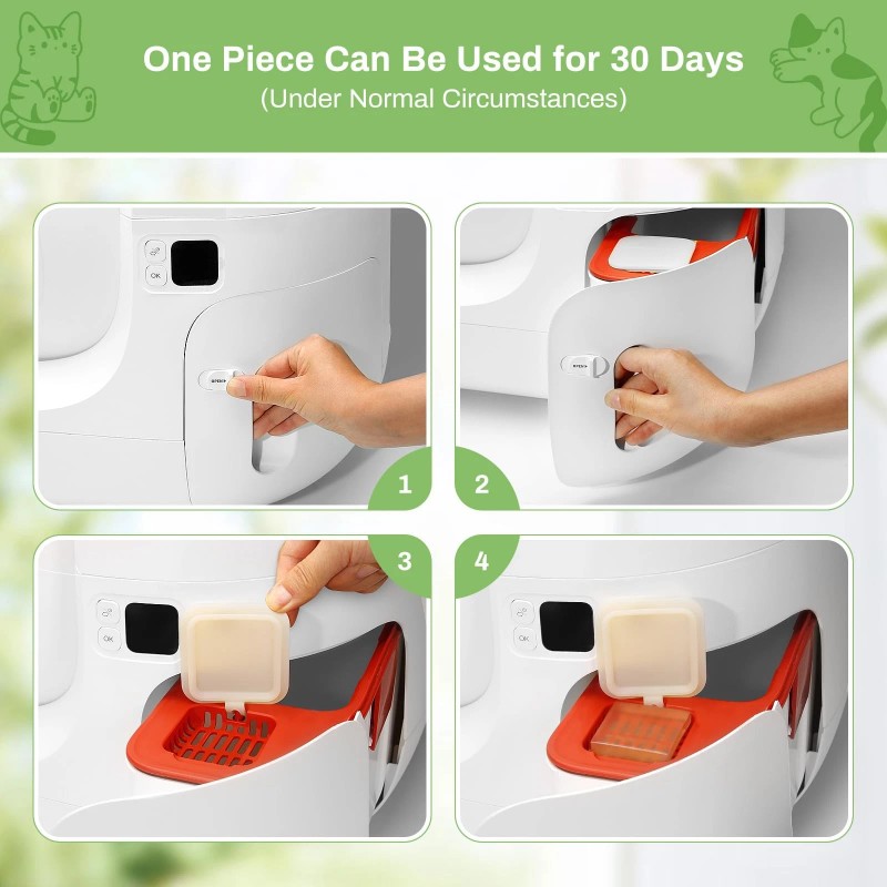 😺 Odor eliminator is designed for MAX automatic self-cleaning cat litter box, it can effectively control odor and prevent unpleasant smell leakage from litter box, ammonia removal rate up to 95%.