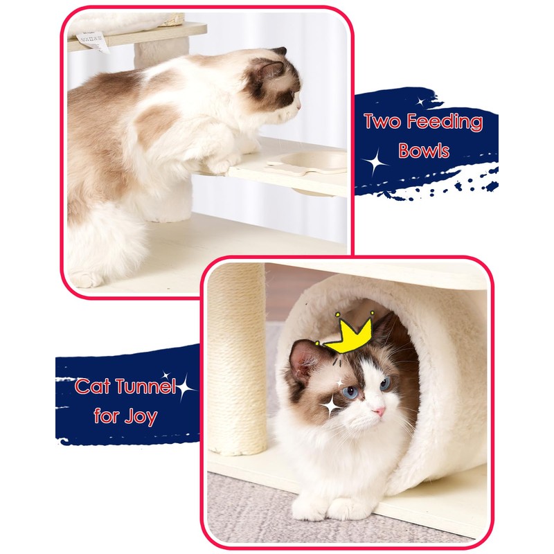 - Not just cat tree but cat park:Your cat can eat, drink, and play with with this all-in-one cat tree,because it has comfortable hammock, hanging fur ball, 2 feeding bowls, and cat tunnel at the bottom. Multi-level structure with multi jumping platforms to make it easy for cats to jump up and down.
