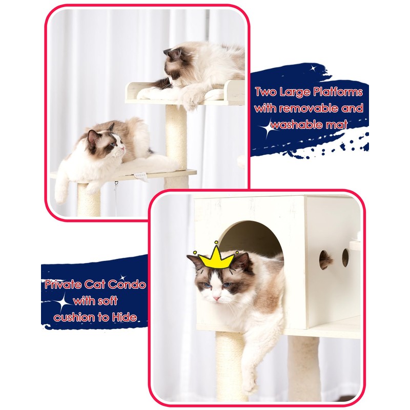 - Not just for your cat, but for your home:Modern design style matches your home better, meantime this tall cat tree provides large top platforms,spacious cat condo and basket espically for indoor adult cats and multi-cats!
