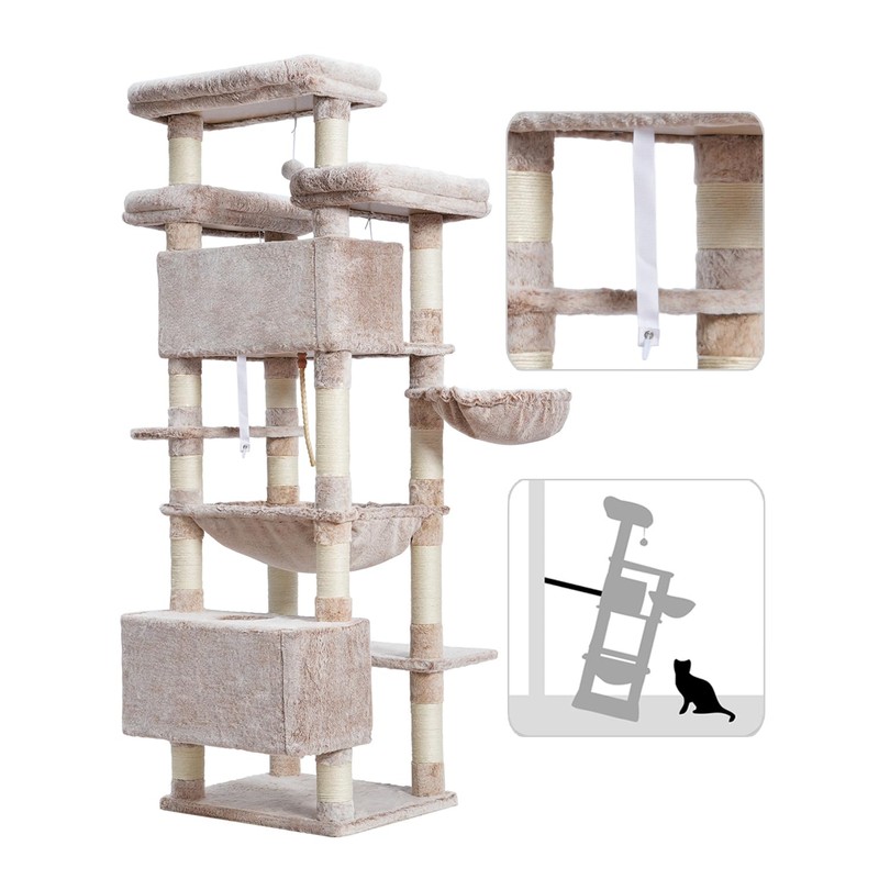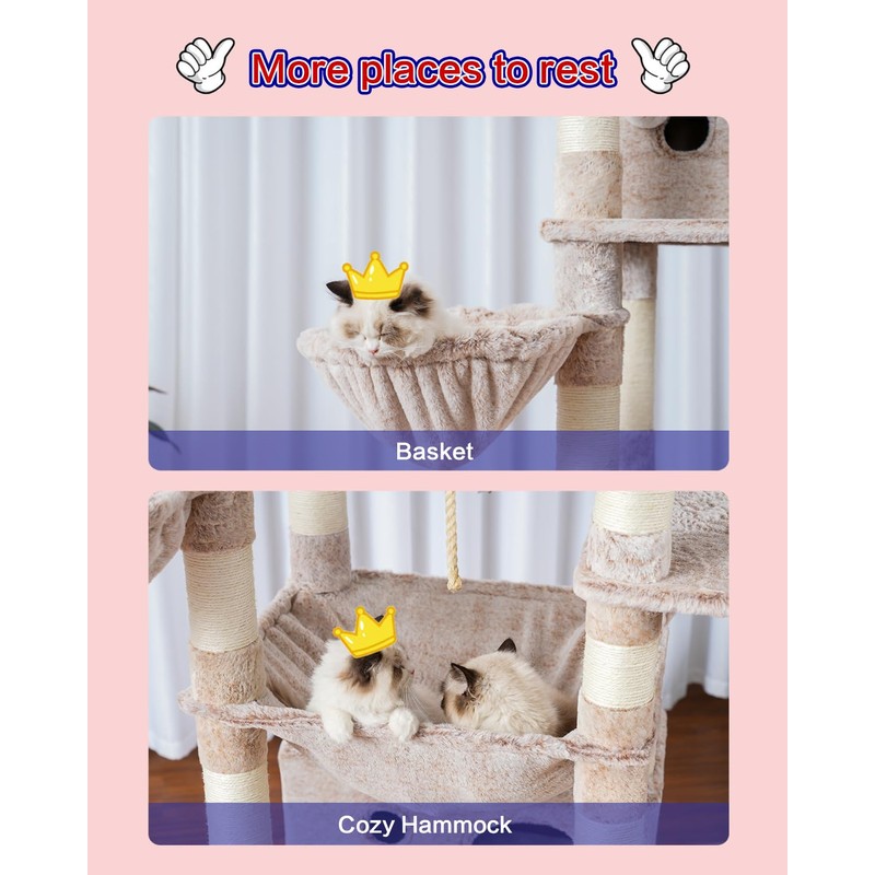 - Unleash nature:Hiding in the cat condos, scratching with sisal posts and rope, climbing via auxiliary platforms, playing with toy ball, Swinging in hammock, kitties can have much fun on this cat tree tower!