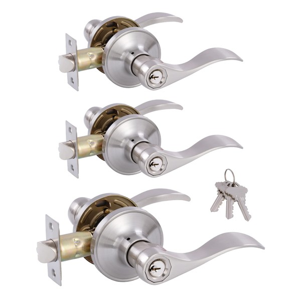GITRANG (3 Pack) Door Levers Interior Keyed Difference Entry Front/Bedroom Door Handles for Left and Right Opened Door with Lock and Keys Set in Satin Nickel