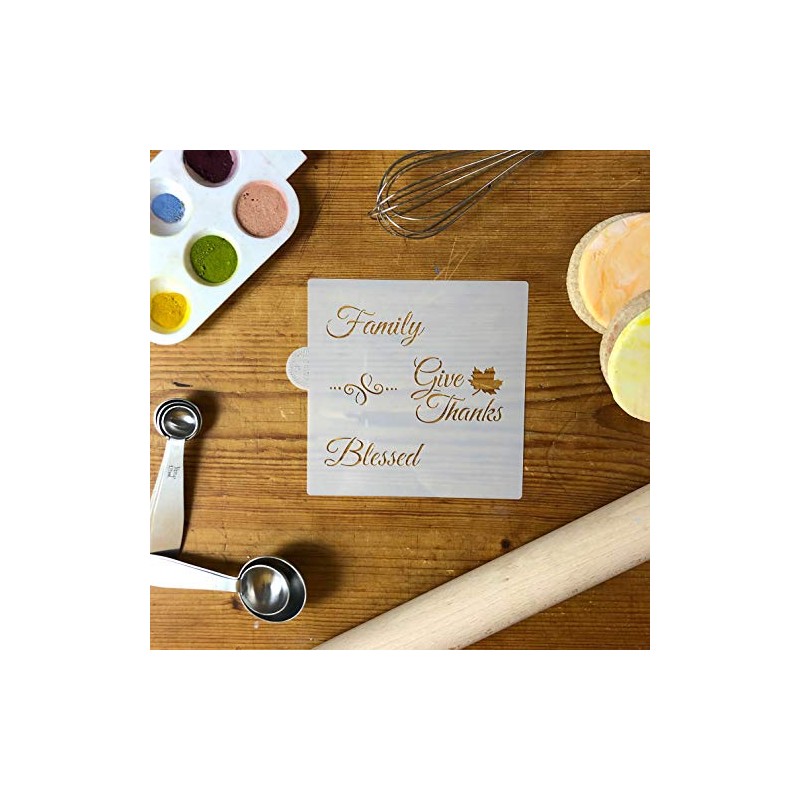 - Size of pattern is: approximately 2.5 inches wide and 1 inches high for Family and Blessed; 2.4 inches wide and 1.7 inches high for Give Thanks. Stencil plastic, not including thumb hold is: 5.5 inches high x 5.5 inches wide.