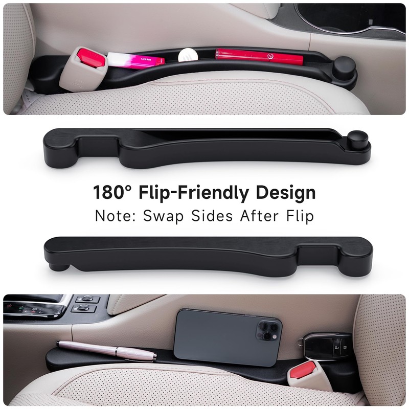 Givifive Multifunctional Car Seat Side Gap Filler 2 Pack (Black) A Great Car Seat Accessories You MUST HAVE!3 in 1 for Car Seat Gap Filler, Auto Console Side Organizer and Hook Function for DrinkCar Seat Gap Filler Fill The Gap Between Seat and Console Stop Things from DroppingConsole Side Car Organizer for Storage Cellphone Wallet Keys Coins and more small thingsRing design on the end help hang drink, light items or keep shopping bags upright (to prevent items from falling apart)Innovative Design, Significant Advantages3-in-1 multifunctional design: One product meets your multiple needsHigh quality soft foam material: High temperature resistance, washable, not easy to deform100% Gap Coverage in front of, surrounding and behind seat belt catchEasy to Install: These gap fillers are easy to install and do not interfere with your seatbelt, moves with the seat and no need to readjust or reinstall.One size fits most vehicles, for most car trucks and SUVsPackage Includes:The package contains two car seat gap fillers to cover the driver and passenger seats.(Please confirm the correct installation direction before installation)