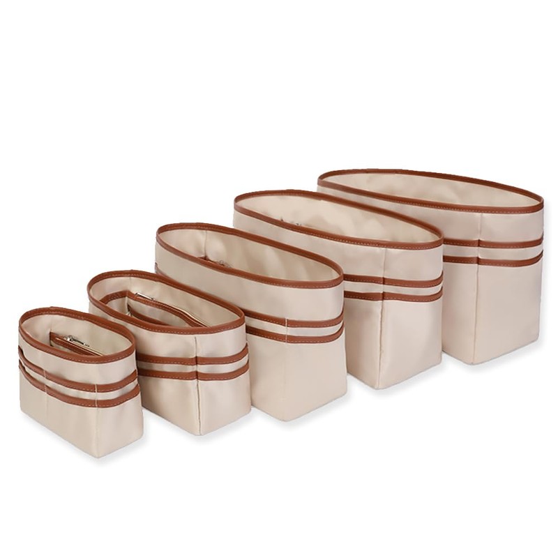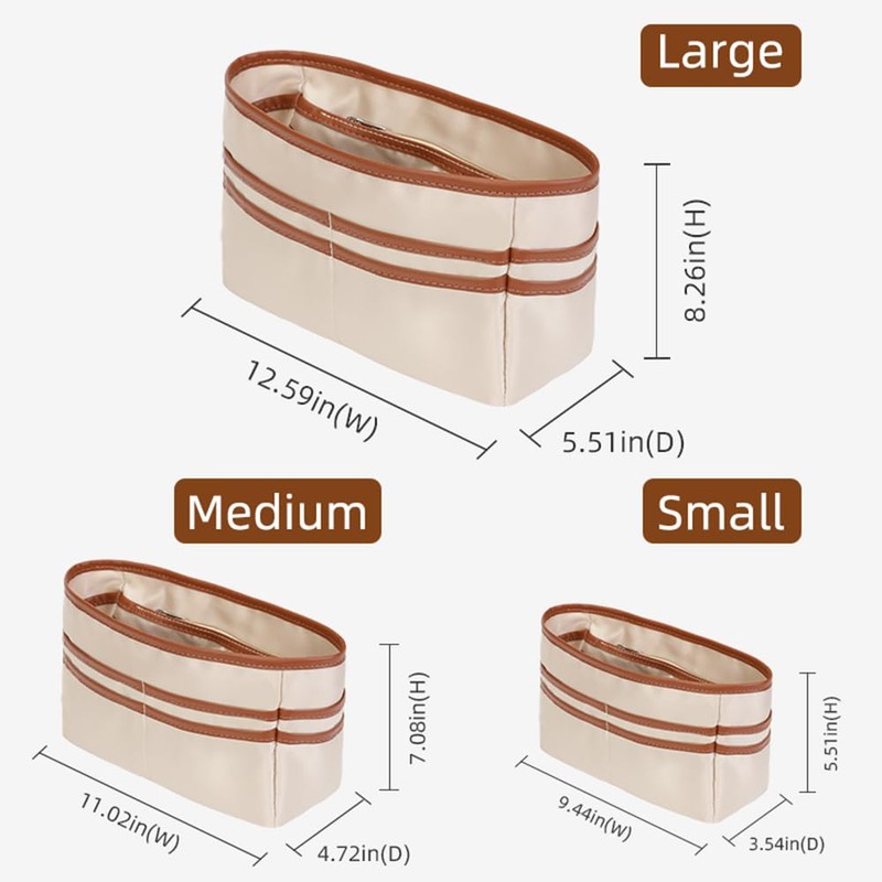 - Material Description: The entire handbag organizer insert is made of silk, leather, and two zippers. The advantage of silk is that it is soft, skin friendly, and has a glossy finish. The handle is also made of soft brown leather, which not only serves as a decorative element but is also very practical.