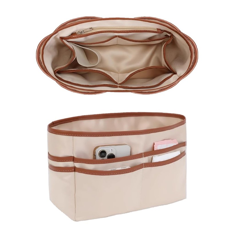- Stop worrying about not finding what you need!Our handbag organizer insert keeps you away from clutter.There are 12 pockets on the outside. There are 10 internal pockets, including a water cup holder and a zippered pocket.The material of the edging is leather.