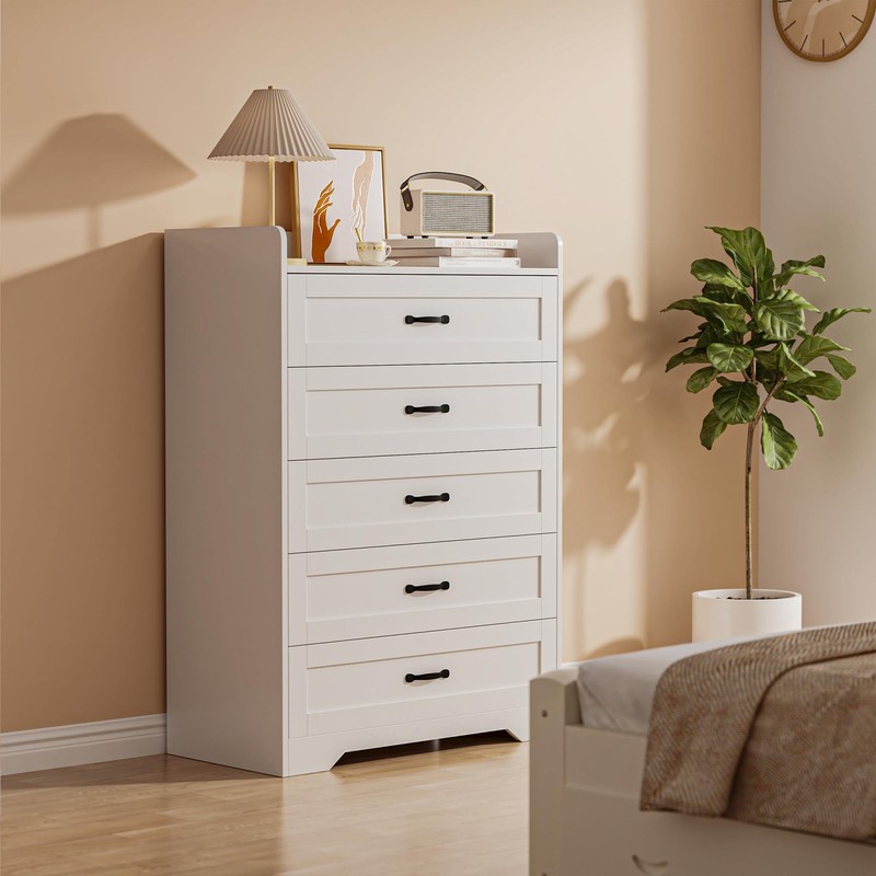 - ELEGANT DESIGN: The flat top of the 5-drawer dresser can accommodate lamps, books, etc., the rounded corners also prevent items from falling, the widened cabinet feet enhance stability, and the elegant handles increase beauty