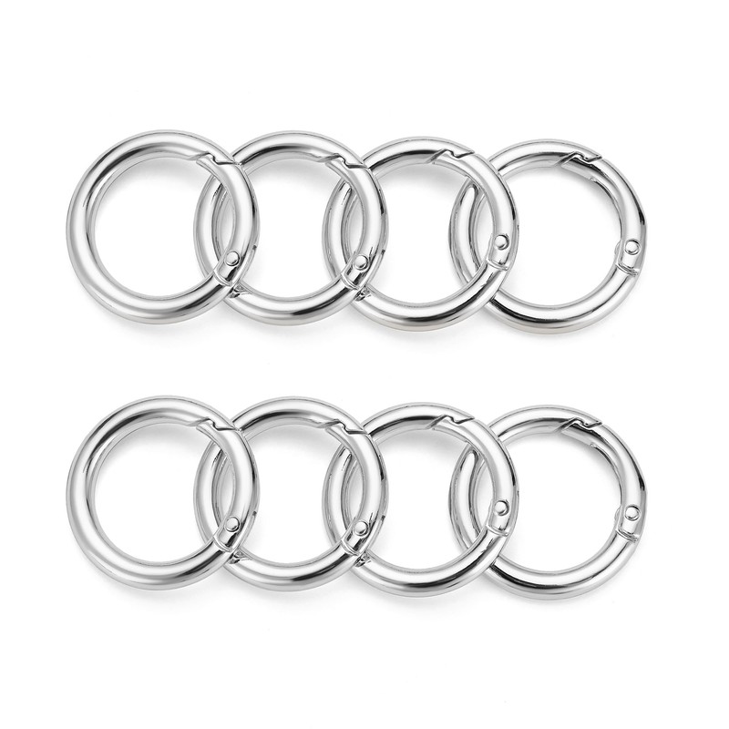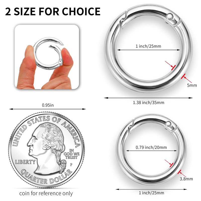 - Spring Clasp Carabiner Details: Receive a set of 8 heavy duty key ring. The outer diameter of the round snap ring clip is approximately 1" (25mm), with an inner diameter of 4/5" (20mm) and a snap ring thickness of 4mm. The manual measurements may vary by up to ±1mm.