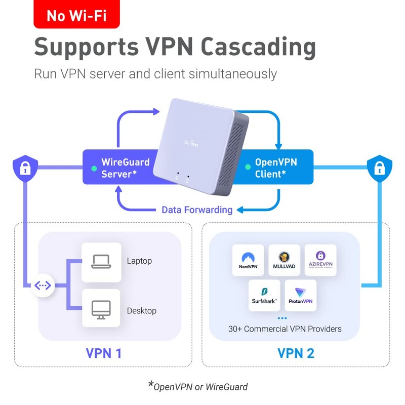 - 【Kompatibel mit über 30 VPN-Dienstanbietern】 Vorinstalliert mit OpenVPN und WireGuard. OpenVPN-Geschwindigkeiten von bis zu 150 Mbit/s; WireGuard erreicht Geschwindigkeiten von bis zu 355 Mbit/s. ***KEINE WLAN-Funktion***