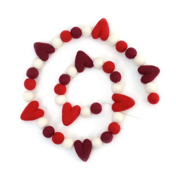 Glaciart One Valentine Felt Ball Garland with Red Hearts - Handmade in Nepal Using New Zealand Wool - Reusable, Durable, Stylish & Versatile - Easy to Hang & Maintain – 8ft, 8 Hearts, 32 Balls