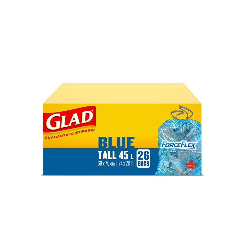 Glad Blue Recycling Bags - Tall 45 Litres - ForceFlex, Drawstring, 26 Trash Bags, Made in Canada of Global Components