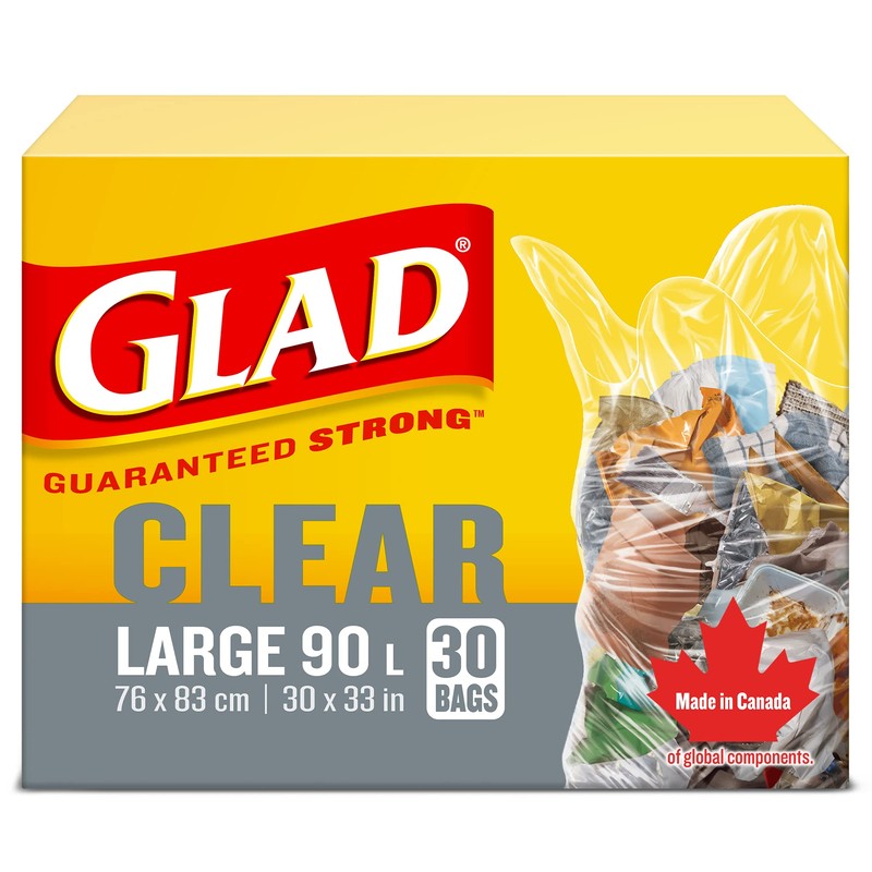 Glad Clear Garbage Bags - Large 90 Litres - 30 Trash Bags, Made in Canada of Global Components